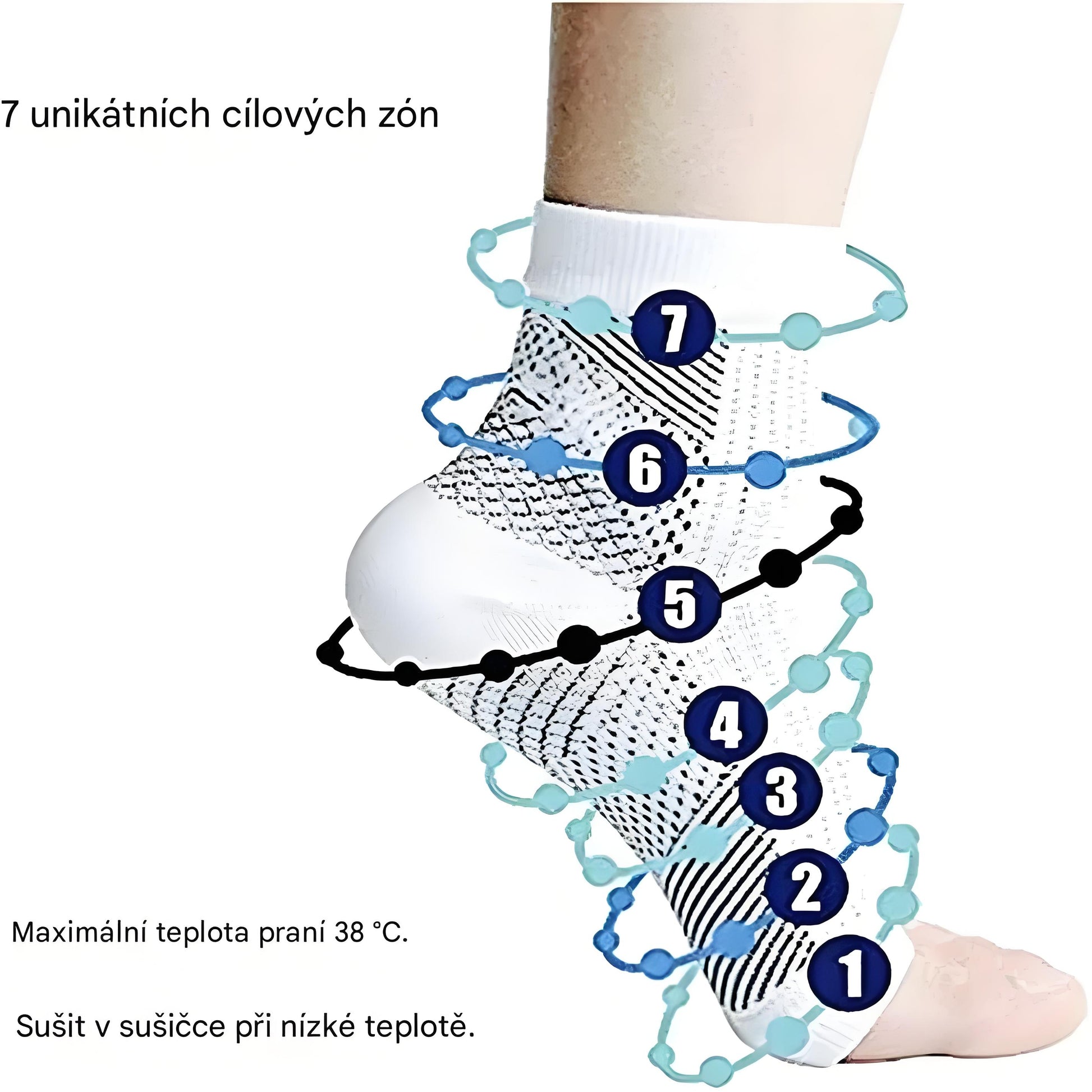 Zóny přesné komprese Díky 5 cíleným kompresním zónám zlepšují cirkulaci krve, uvolňují napjaté svaly a zmírňují bolest. Jsou ideální při problémech jako plantární fasciitida nebo neuropatie a přizpůsobí se individuálním potřebám vašich chodidel.