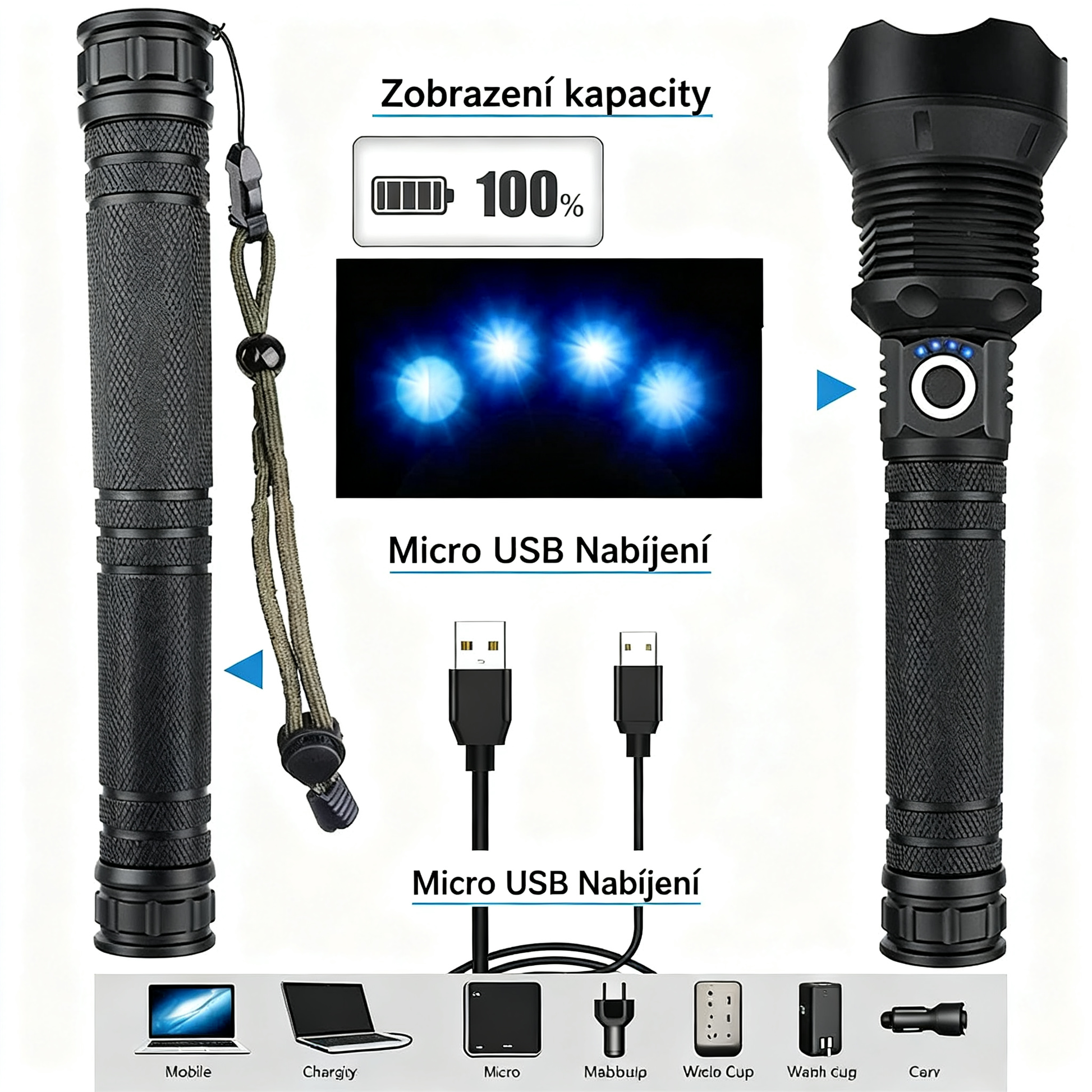 Taktická svítilna Neovarms vysokým jasem, s vestavěnou XHP70 Super Bright LED pro maximální výkon až 20000 lumenů,